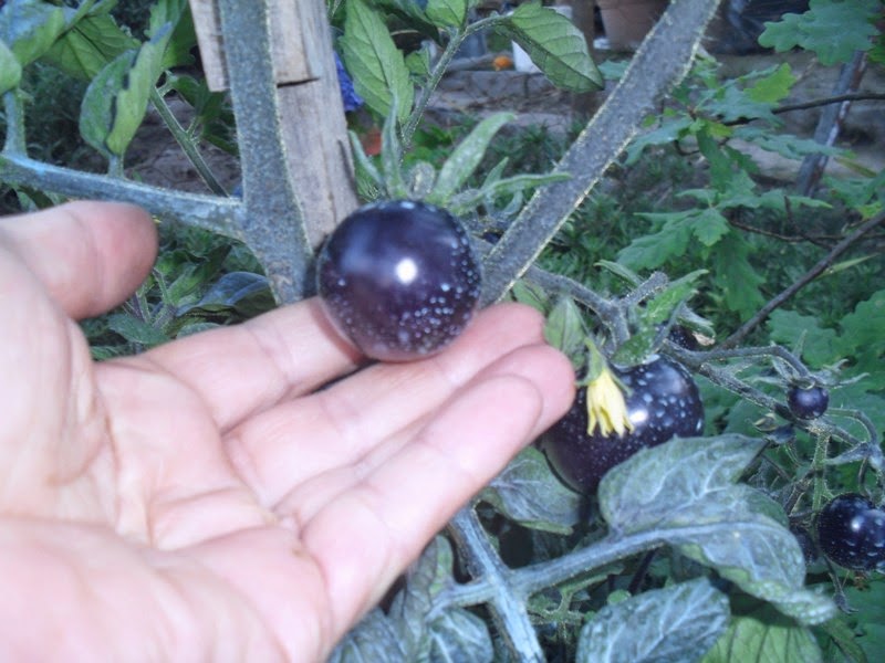 Se não estou em erro...este deve ser o Cherokee Purple, o tomateiro mais bem "composto" da horta (cachos/tomates)!
